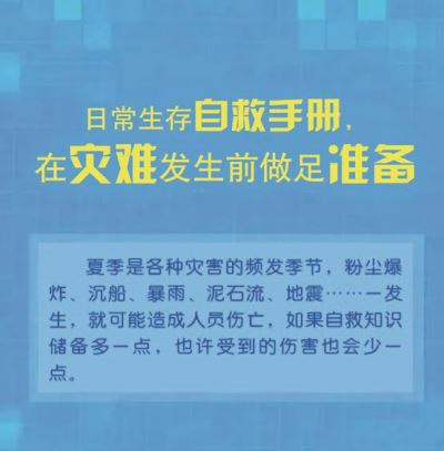 夏季是各种灾害的频发季节,暴雨、粉尘爆炸、沉船、泥石流……灾难一旦发生,就会造成人员伤亡,如果自救知识储备多一点,也许受到的伤害就会少一点。