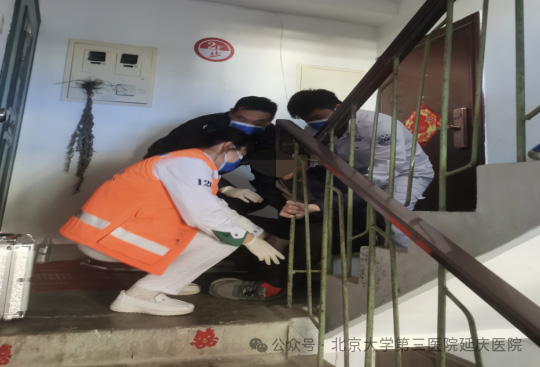 2026年3月15日下午,医生郭睿晗、护士李文正、司机杨金生、担架员窦爱龙急救车组,接到紧急求救任务,某小区二楼有一位高龄老人意外摔伤,情况紧急,急需救治。接到任务后,急救团队迅速出动,急救车立即鸣笛出发,以最快速度赶赴现场。抵达现场后,急救人员第一时间查看患者情况,只见老人坐在楼道转角的板凳上,面露痛苦,左脚因扭伤疼痛难忍,左侧肢体活动明显受限。
