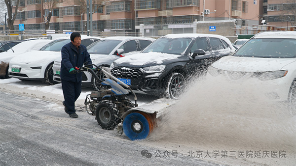 虽然延庆的初春寒意依然,但院区及周边道路上却是一派热火朝天、干劲十足的忙碌景象。医院领导、各临床科室医护人员、行政后勤职工们分工协作、相互配合,有的铲、有的扫、有的将积雪对成堆儿……在大家的共同努力下,门急诊出入口、院区主干道、停车通道、院外周边步道等重要点位的积雪全部清理干净。